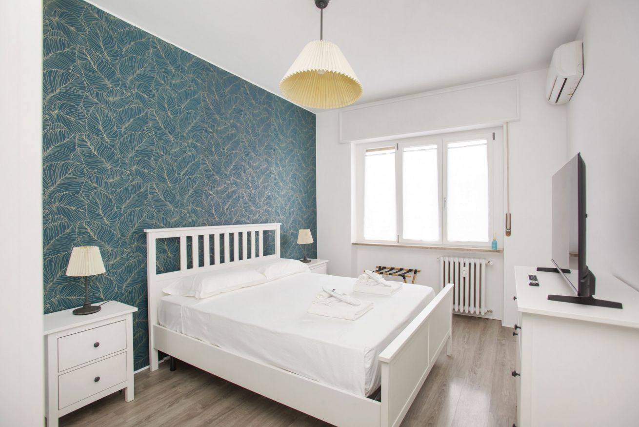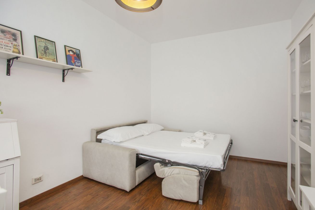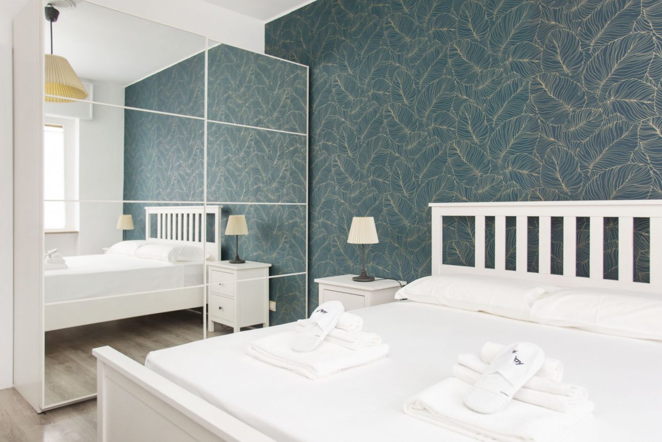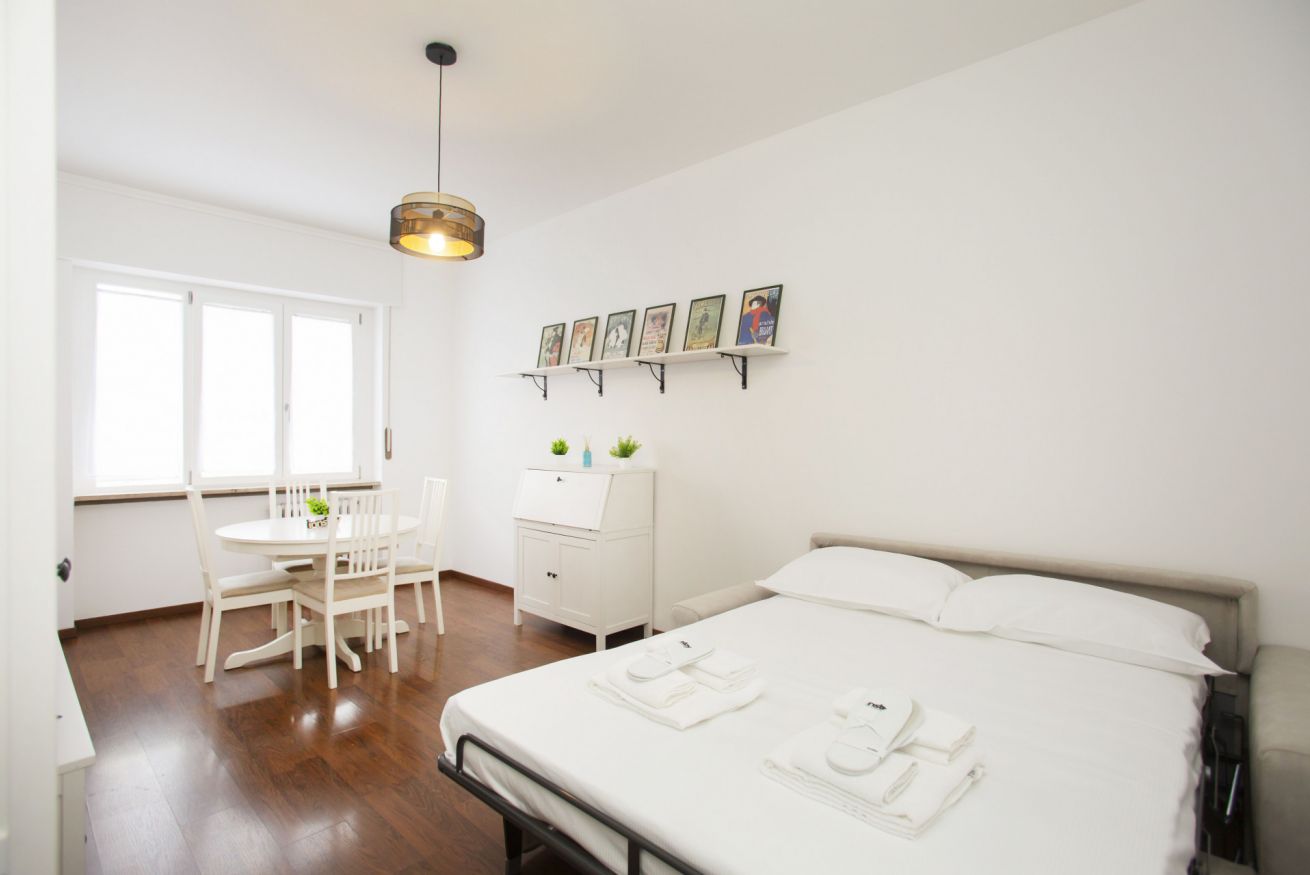 The accommodation offers a modern and well-appointed environment: an elegant bedroom with decorative wall, comfortable double bed and quality linens; a cozy living area with sofa bed, flat-screen TV and dining table ideal for working or relaxing; a kitchen equipped with everything you need for short or longer stays.