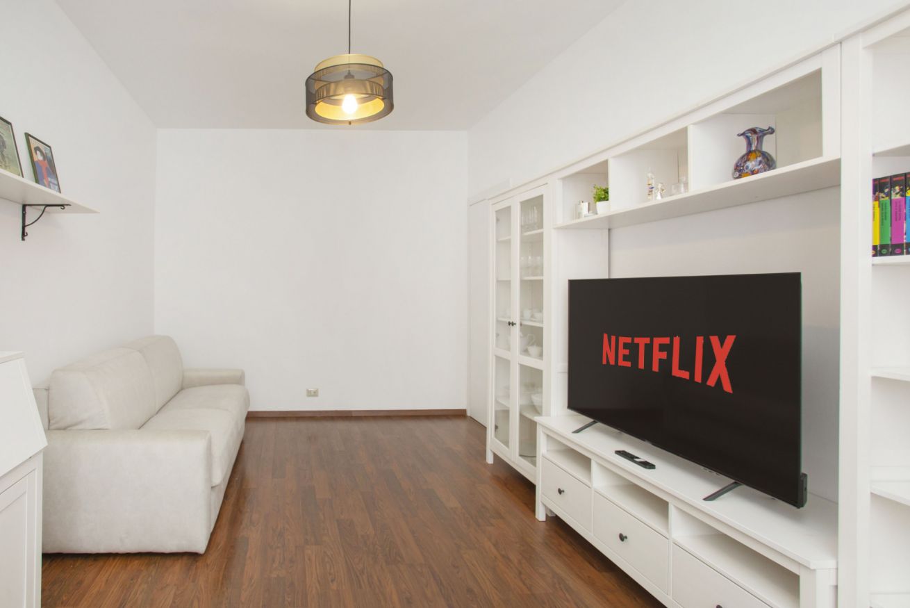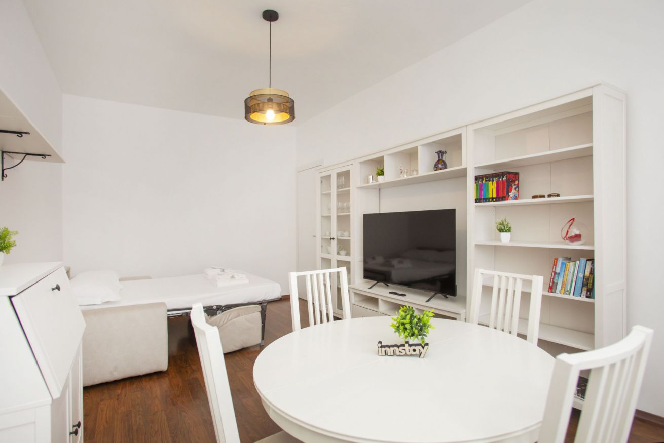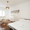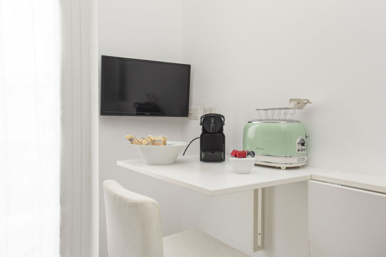 The accommodation offers a modern and well-appointed environment: an elegant bedroom with decorative wall, comfortable double bed and quality linens; a cozy living area with sofa bed, flat-screen TV and dining table ideal for working or relaxing; a kitchen equipped with everything you need for short or longer stays.