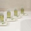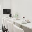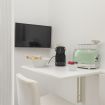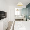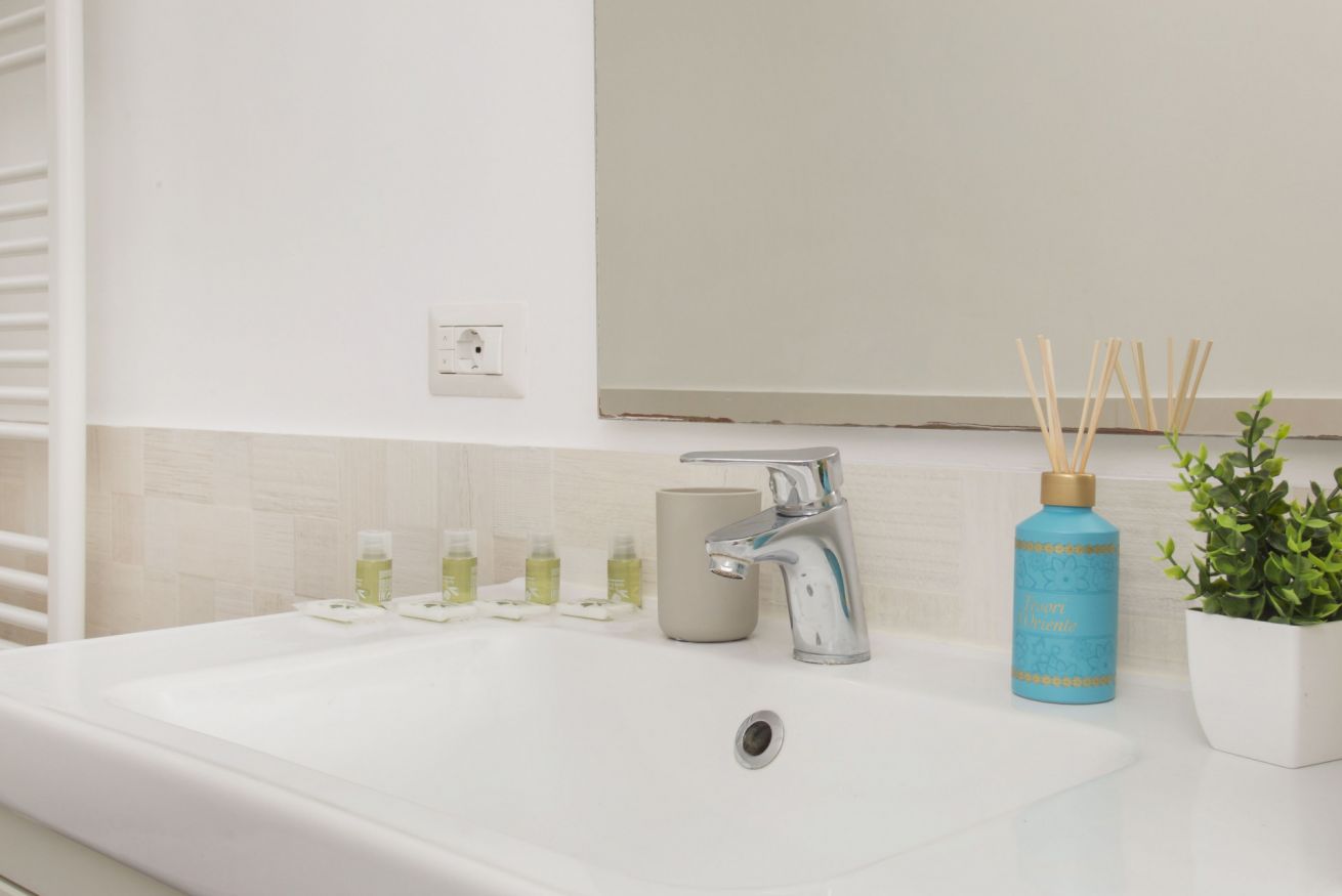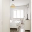 The minimalist design and light-colored furnishings make the spaces airy and pleasant, while details such as fresh towels, amenities, and small decorative touches create a boutique hotel atmosphere.