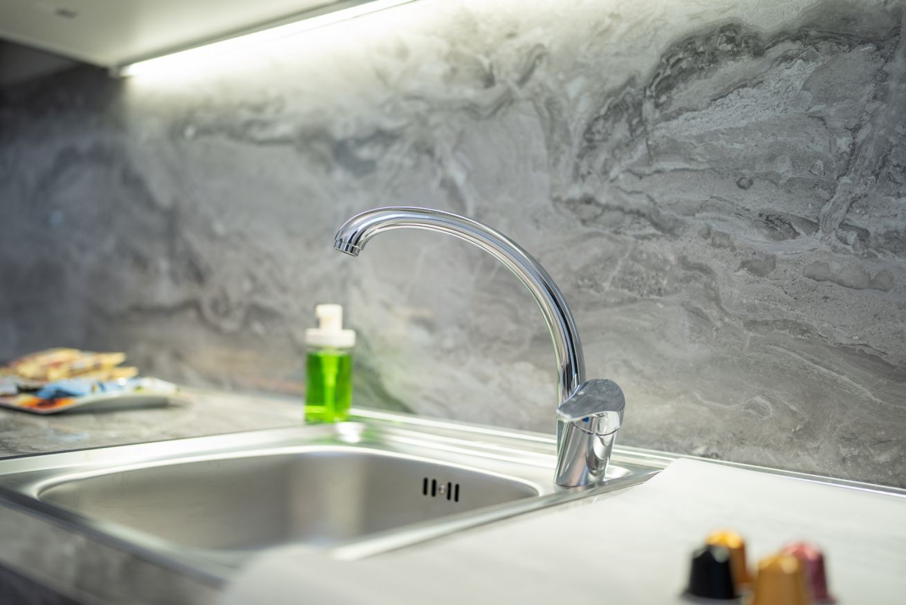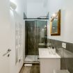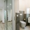 It includes a modern bathroom and a living area with a fully equipped kitchen.