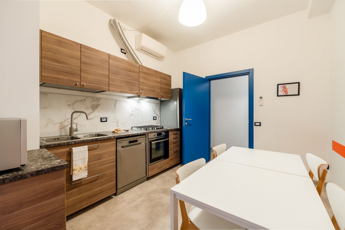 The shared living area is cozy and ideal for socializing: a large living room with sofas and a dining area, as well as a fully equipped shared kitchen, perfect for preparing meals together.