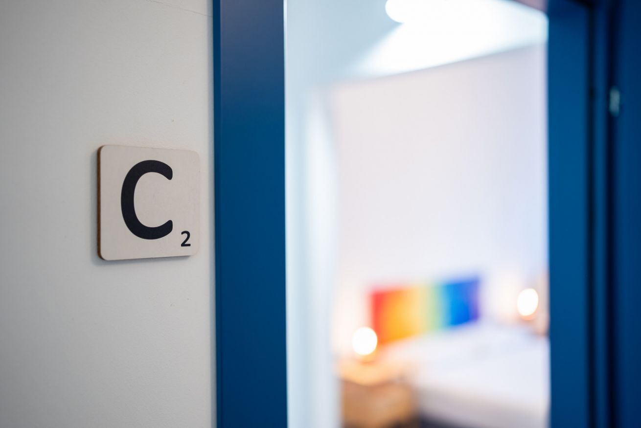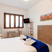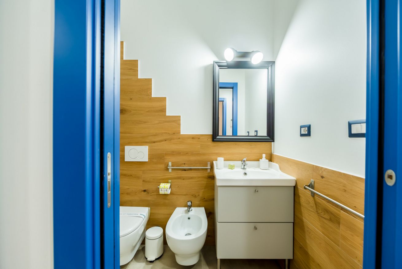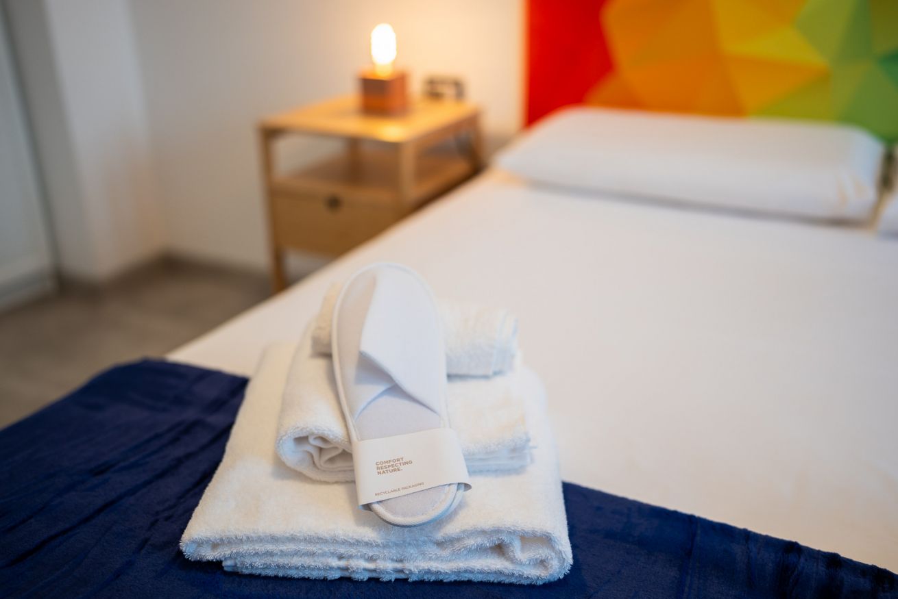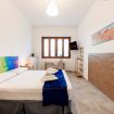 The shared living area is cozy and ideal for socializing: a large living room with sofas and a dining area, as well as a fully equipped shared kitchen, perfect for preparing meals together.