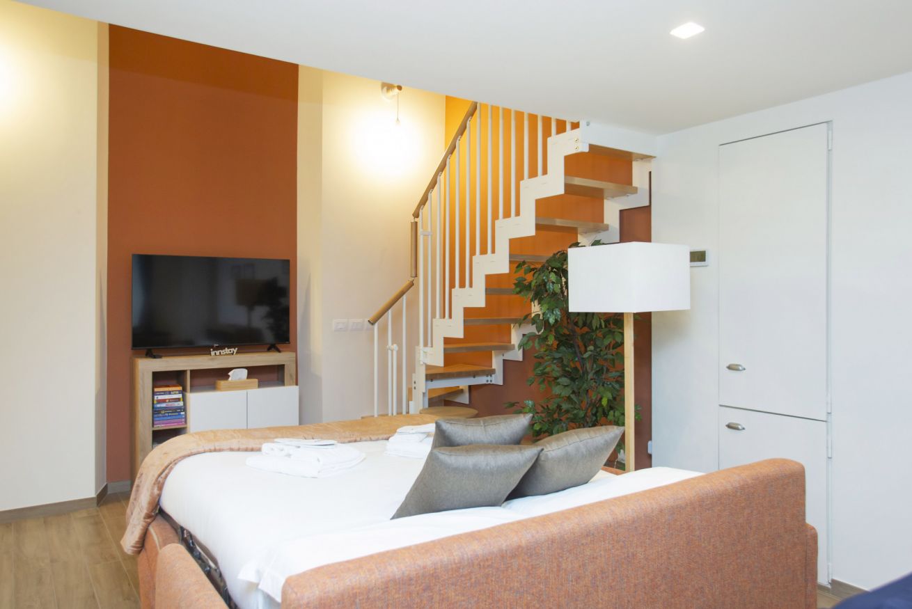 L’appartamento è curato nei dettagli, con asciugamani e set di benvenuto, arredi contemporanei e una scala moderna che collega armoniosamente gli spazi.