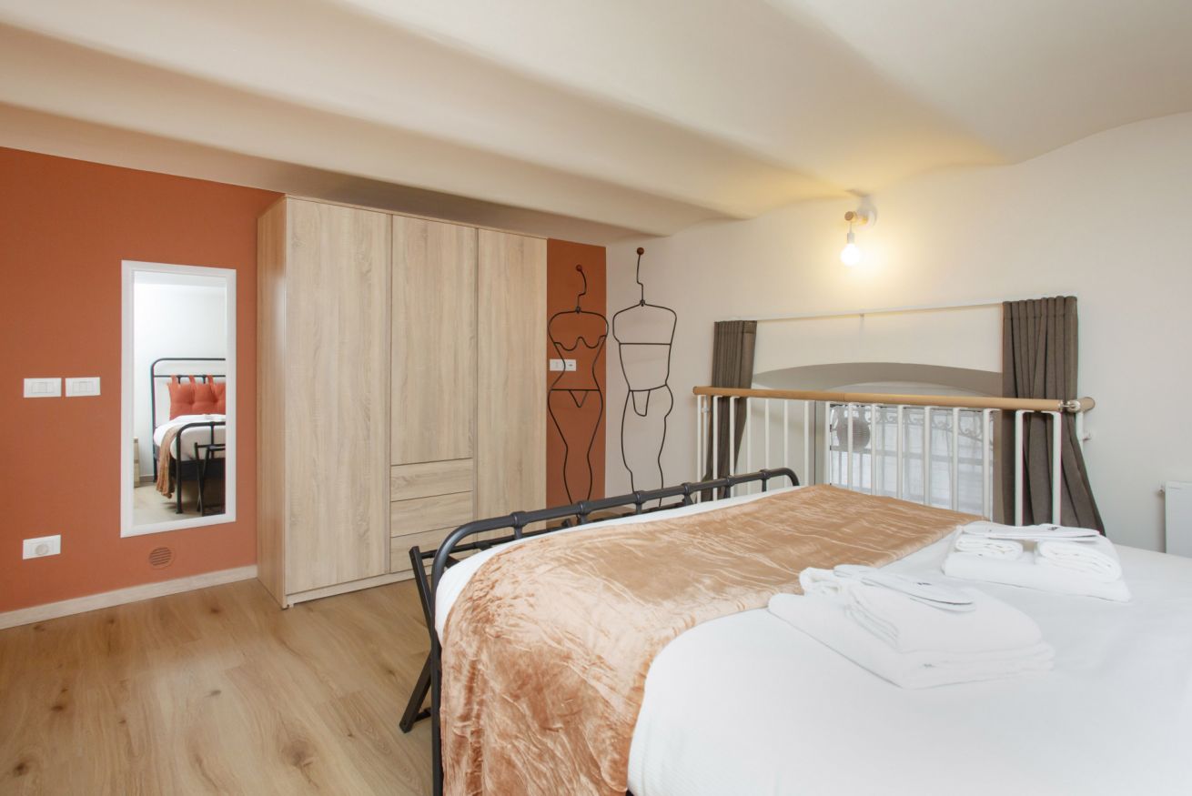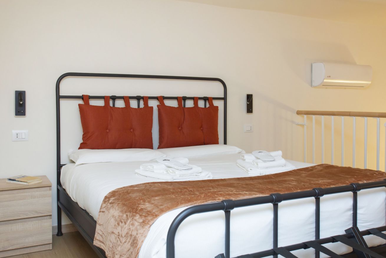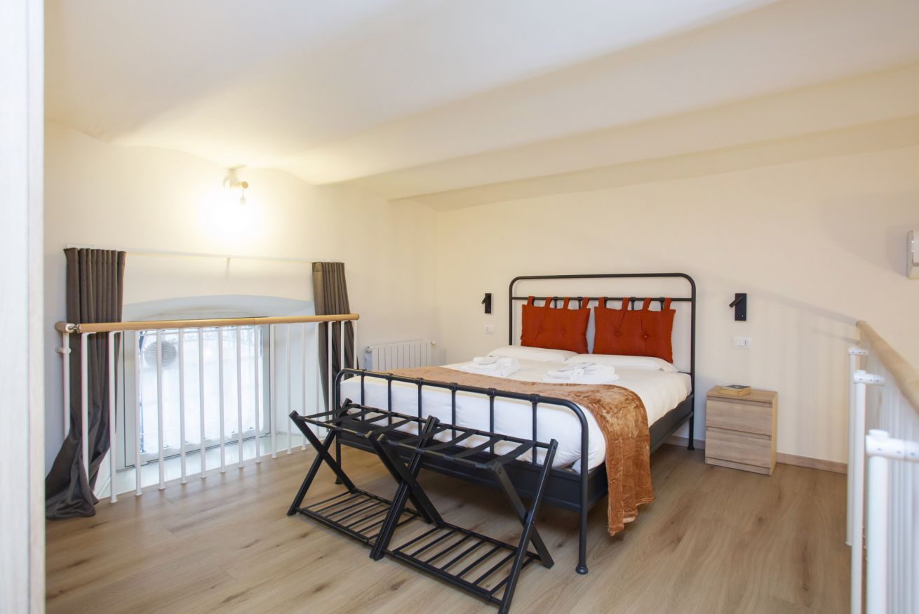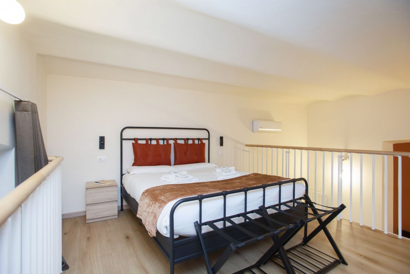 Al piano superiore si trova una camera da letto accogliente con letto matrimoniale, illuminazione soft e una finestra che dona un’atmosfera intima da loft.