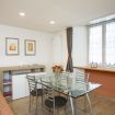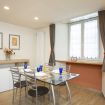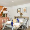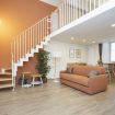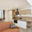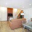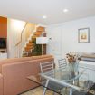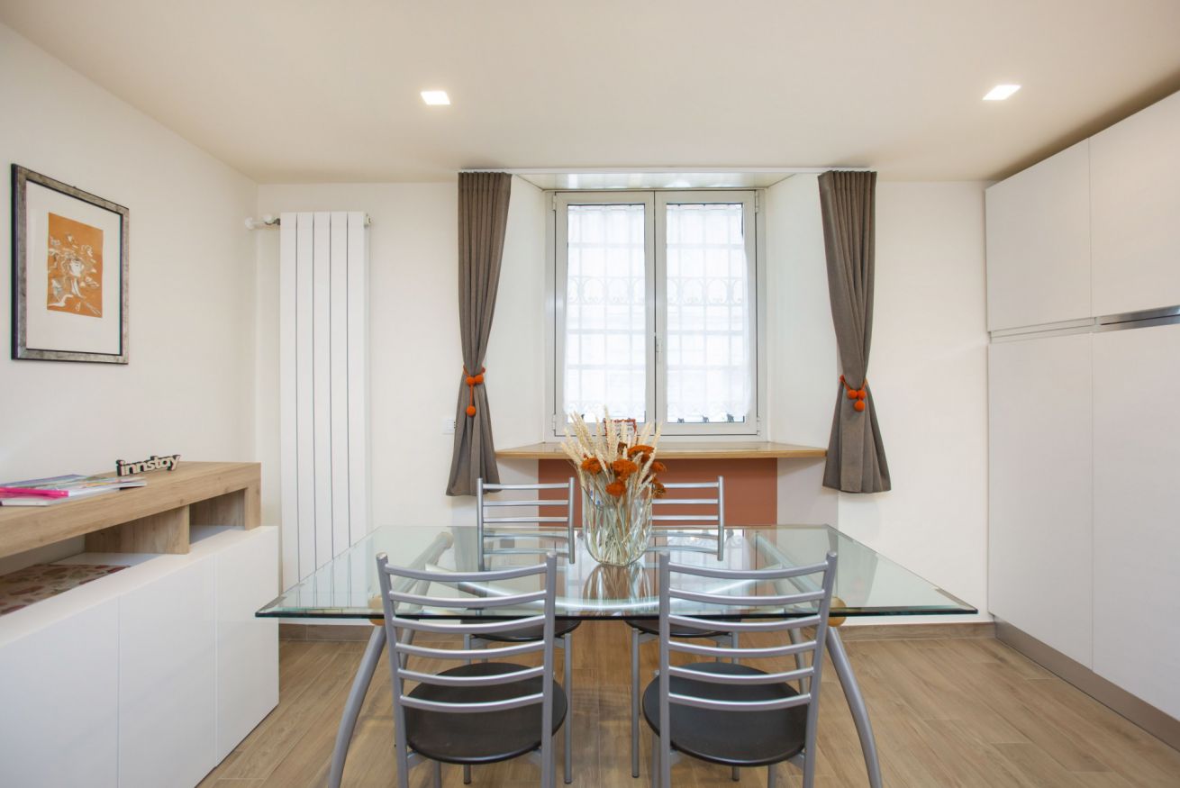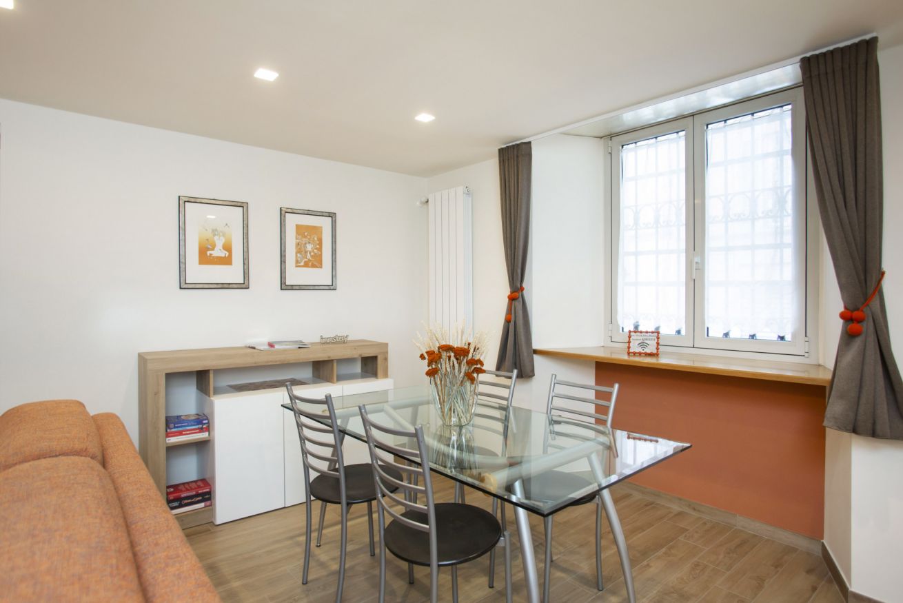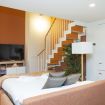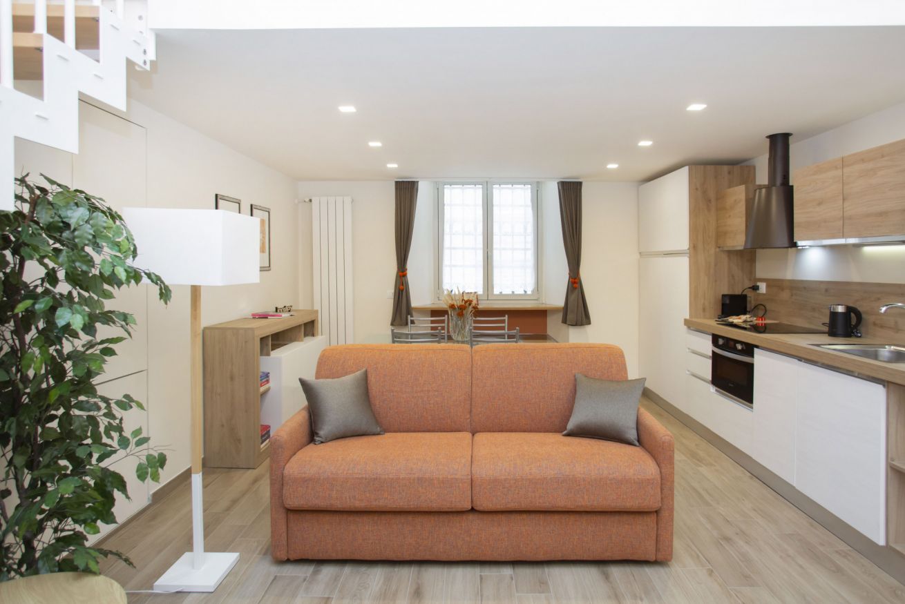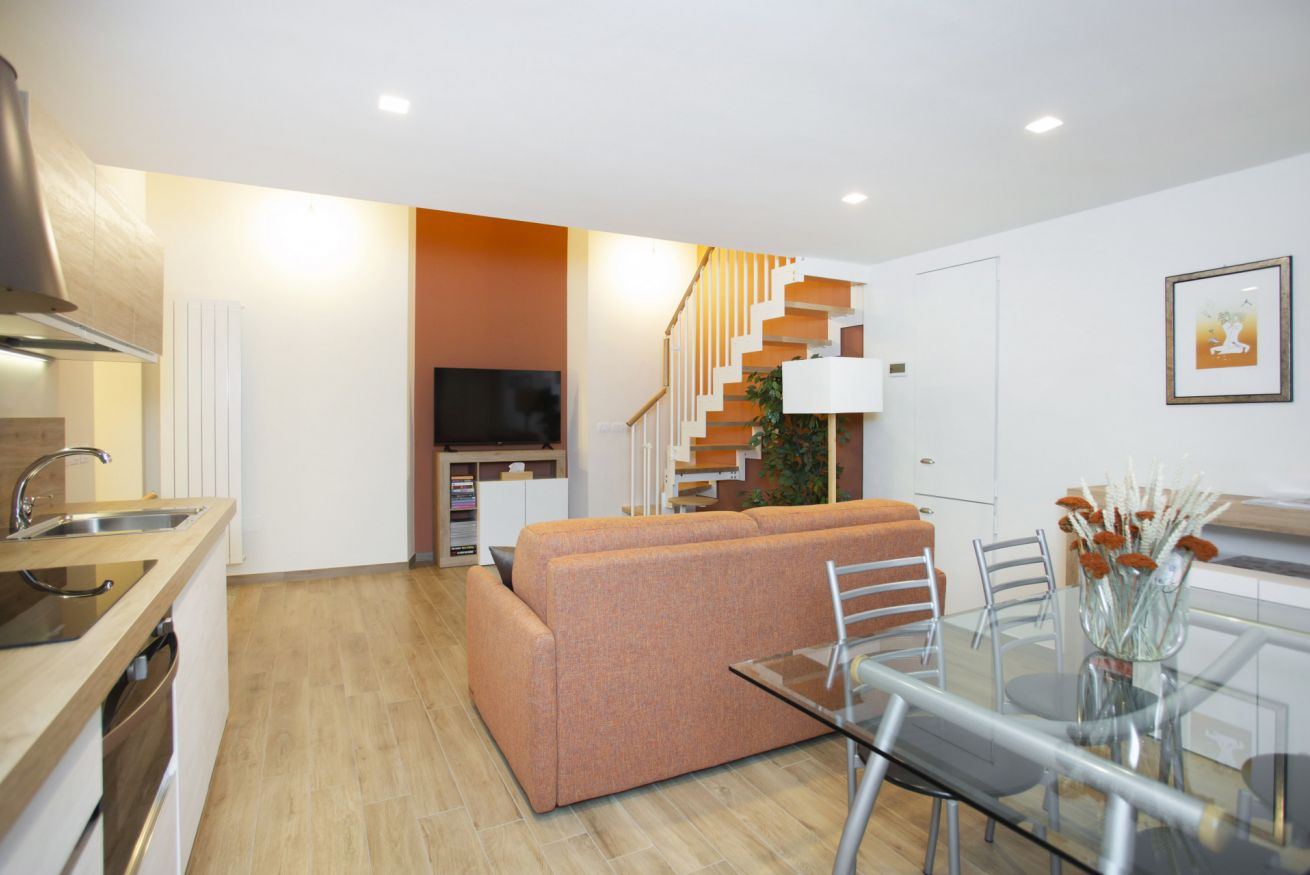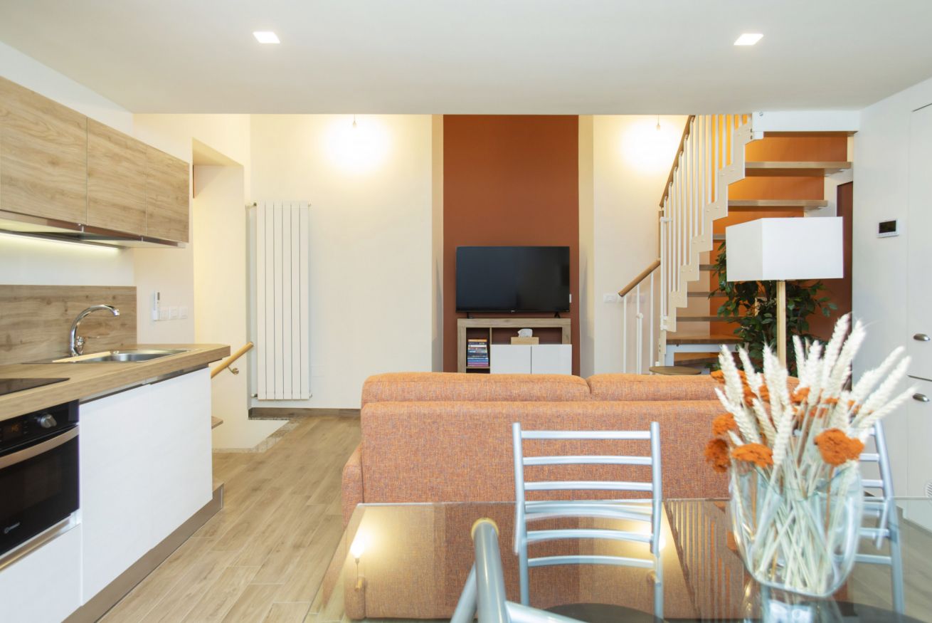 Al piano principale l’open space unisce un soggiorno elegante con divano arancione, una zona pranzo con tavolo in vetro davanti alle grandi finestre e una cucina completamente attrezzata con finiture in legno e bianco.